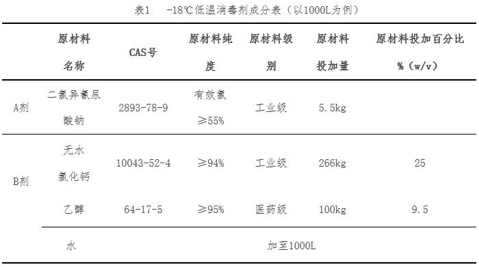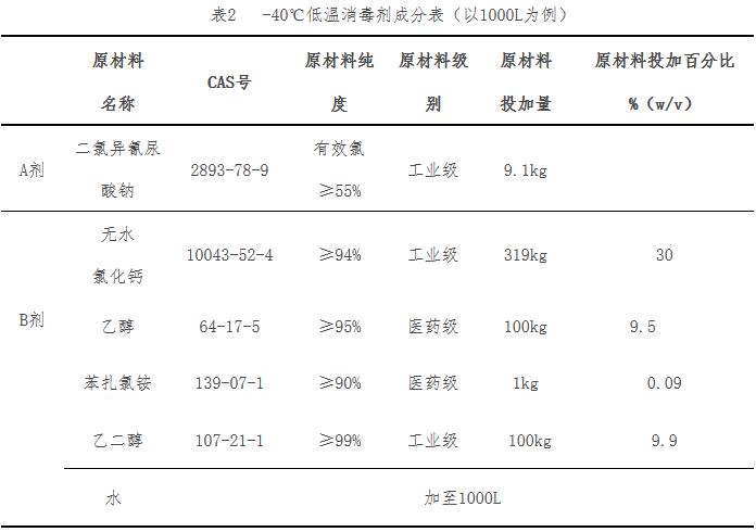 (二)低溫消毒劑(-40℃)。包括二氯異氰尿酸鈉、氯化鈣、乙醇、乙二醇和苯扎氯銨。現(xiàn)場使用時,-40℃低溫消毒劑中有效氯濃度為0.5%(5000mg/L),無水氯化鈣的含量為30%,乙醇9.5%,乙二醇9.9%,苯扎氯銨0.09%。詳見表2。