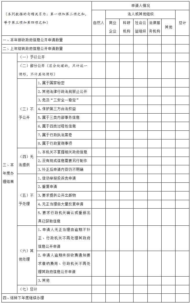 這一項(xiàng)主要報(bào)告兩方面情況:一是申請(qǐng)人的類別;二是政府信息公開申請(qǐng)的最終處理結(jié)果。此項(xiàng)內(nèi)容重在數(shù)據(jù)準(zhǔn)確、要素齊備,全面客觀反映政府信息公開申請(qǐng)接收和辦理情況,便于政府信息公開工作主管部門全面掌握工作動(dòng)態(tài),使社會(huì)各界了解政府公開透明進(jìn)程。