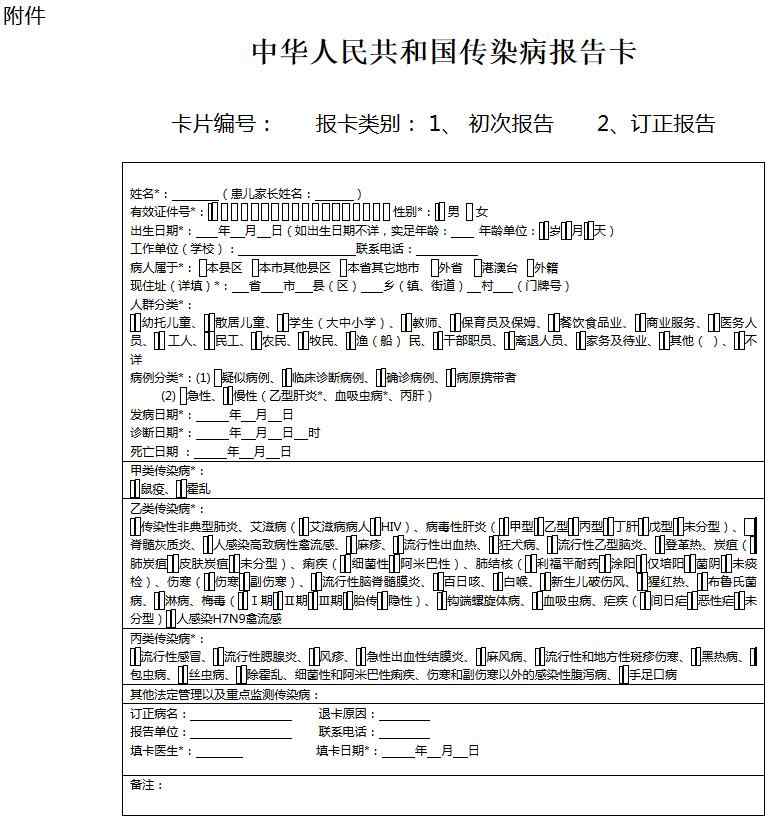 一、乙類傳染病肺結(jié)核分類由“涂陽、僅培陽、菌陰、未痰檢”調(diào)整為“利福平耐藥、涂陽、僅培陽、菌陰、未痰檢”。調(diào)整后的《中華人民共和國傳染病報告卡》(以下簡稱傳染病報告卡)詳見附件。