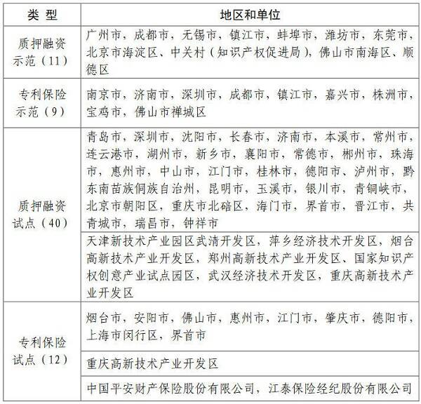 專利質(zhì)押融資及專利保險(xiǎn)試點(diǎn)示范地區(qū)和單位名單