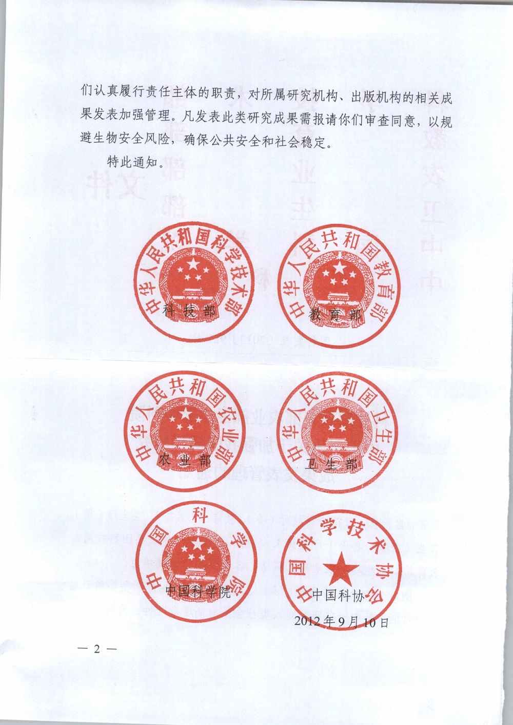 國科發(fā)社〔2012〕921號《科技部教育部農(nóng)業(yè)部衛(wèi)生部中科院中國科協(xié)關(guān)于加強我國病毒研究成果發(fā)表管理的通知》