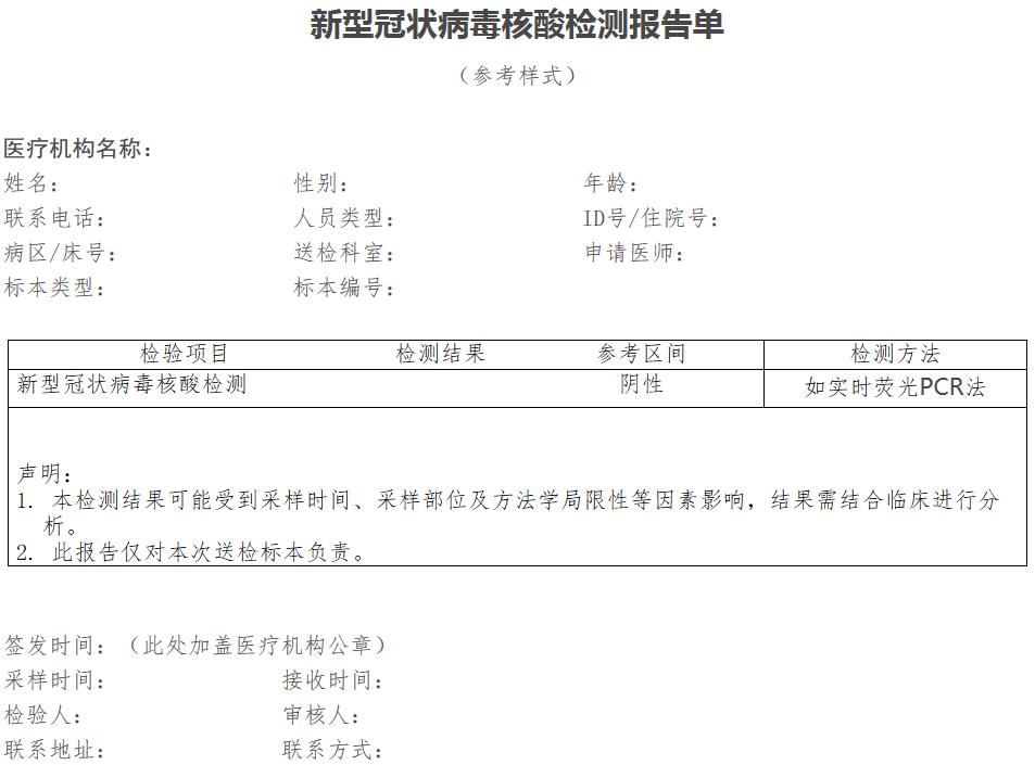 (二)檢測報告。各醫(yī)療機構(gòu)應(yīng)當(dāng)按照《新型冠狀病毒核酸檢測報告單》的參考樣式出具檢測報告(見附件),在衛(wèi)生健康行政部門的規(guī)定下,互認(rèn)檢測結(jié)果。醫(yī)療機構(gòu)可采用紙質(zhì)、快遞、網(wǎng)絡(luò)或信息化系統(tǒng)等多種形式,發(fā)放核酸檢測報告,并注意保護(hù)個人隱私。發(fā)現(xiàn)核酸檢測陽性結(jié)果時應(yīng)按相關(guān)要求在12小時內(nèi)進(jìn)行傳染病上報及后續(xù)流行病學(xué)調(diào)查工作。