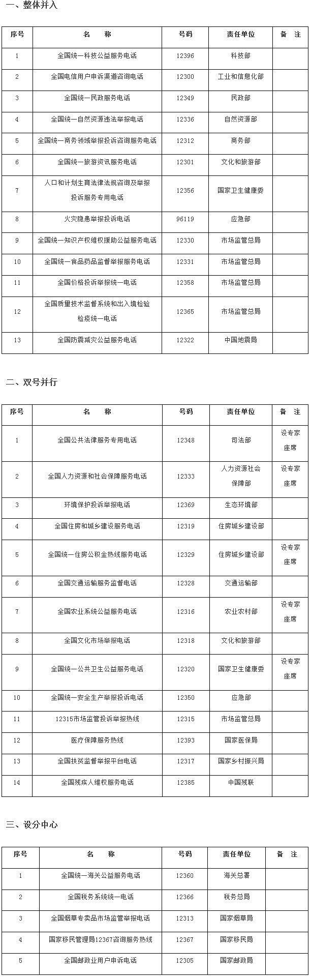 1.分級(jí)分類推進(jìn)熱線歸并。各地區(qū)設(shè)立的政務(wù)服務(wù)便民熱線,要全部取消號(hào)碼,整體并入12345熱線。國務(wù)院有關(guān)部門設(shè)立并在地方接聽的政務(wù)服務(wù)便民熱線,按照以上三種方式歸并到各地區(qū)12345熱線。