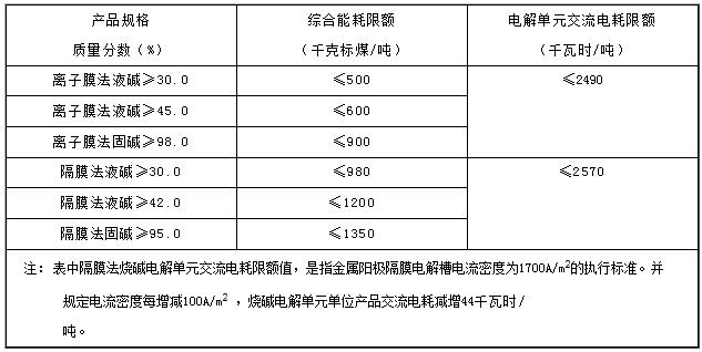 現(xiàn)有燒堿生產(chǎn)裝置單位產(chǎn)品能耗限額指標包括綜合能耗和電解單元交流電耗,其限額值應(yīng)符合以下要求。