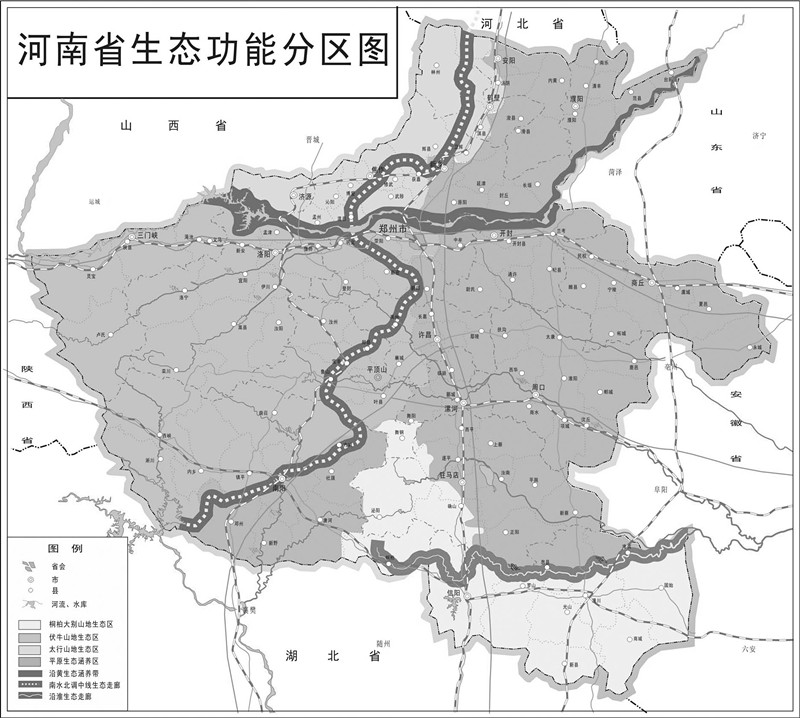 推進(jìn)建設(shè)桐柏大別山地生態(tài)區(qū)、伏牛山地生態(tài)區(qū)、太行山地生態(tài)區(qū)、平原生態(tài)涵養(yǎng)區(qū),構(gòu)建橫跨東西的沿黃生態(tài)涵養(yǎng)帶、沿淮生態(tài)走廊和縱貫?zāi)媳钡哪纤闭{(diào)中線生態(tài)走廊,形成“四區(qū)三帶”的區(qū)域生態(tài)格局。
