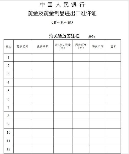 附件:中國人民銀行黃金及黃金制品進(jìn)出口準(zhǔn)許證(非一批一證)