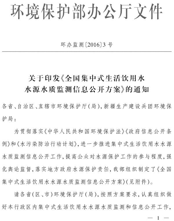 環(huán)辦監(jiān)測(cè)〔2016〕3號(hào)《全國(guó)集中式生活飲用水水源水質(zhì)監(jiān)測(cè)信息公開(kāi)方案》