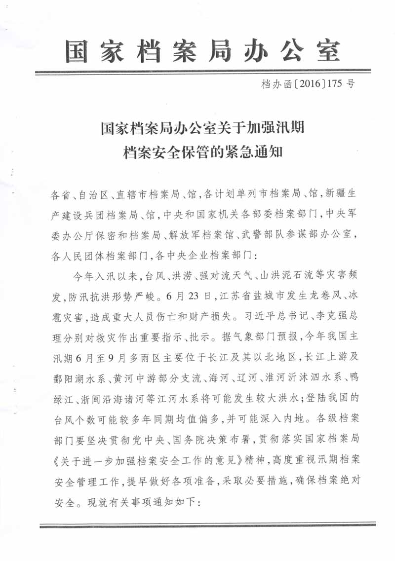 國家檔案局辦公室關于加強汛期檔案安全保管的緊急通知
