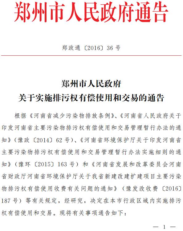 鄭政通〔2016〕36號《鄭州市人民政府關(guān)于實施排污權(quán)有償使用和交易的通告》