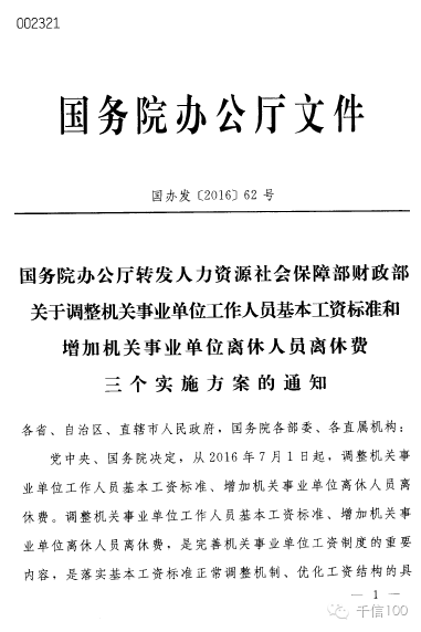 國辦發(fā)〔2016〕62號《國務院辦公廳轉發(fā)人社部財政部關于調整機關事業(yè)單位工作人員基本工資標準和增加機關事業(yè)單位離休人員離休費三個實施方案通知》
