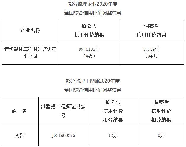 根據(jù)《公路水運工程監(jiān)理信用評價辦法》(交質(zhì)監(jiān)發(fā)〔2012〕774號)規(guī)定和新疆維吾爾自治區(qū)交通運輸廳《關(guān)于撤銷監(jiān)理工程師楊哲信用評價扣分和調(diào)整青海路翔工程監(jiān)理咨詢有限公司信用評分有關(guān)情況的報告》,交通運輸部對部分公路監(jiān)理企業(yè)和監(jiān)理工程師2020年度全國綜合信用評價結(jié)果進行調(diào)整,現(xiàn)予公布。