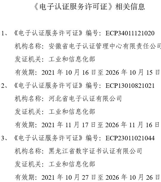 依據(jù)《中華人民共和國行政許可法》第五十條、《中華人民共和國電子簽名法》第二十五條、《電子認證服務管理辦法》第十條等規(guī)定,經(jīng)審查,決定準予安徽省電子認證管理中心有限責任公司、河北省電子認證有限公司、黑龍江省數(shù)字證書認證有限公司等 3 家機構申請的電子認證服務許可延續(xù),《電子認證服務許可證》變更信息詳見附件。