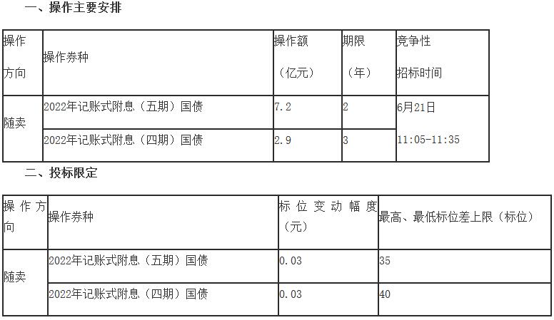 2022年6月24日起與同期國債合并上市交易。中標(biāo)參與機(jī)構(gòu)不遲于2022年6月22日,將隨賣操作款繳入財(cái)政部指定資金賬戶,繳款日期以財(cái)政部指定賬戶收到款項(xiàng)為準(zhǔn)。
