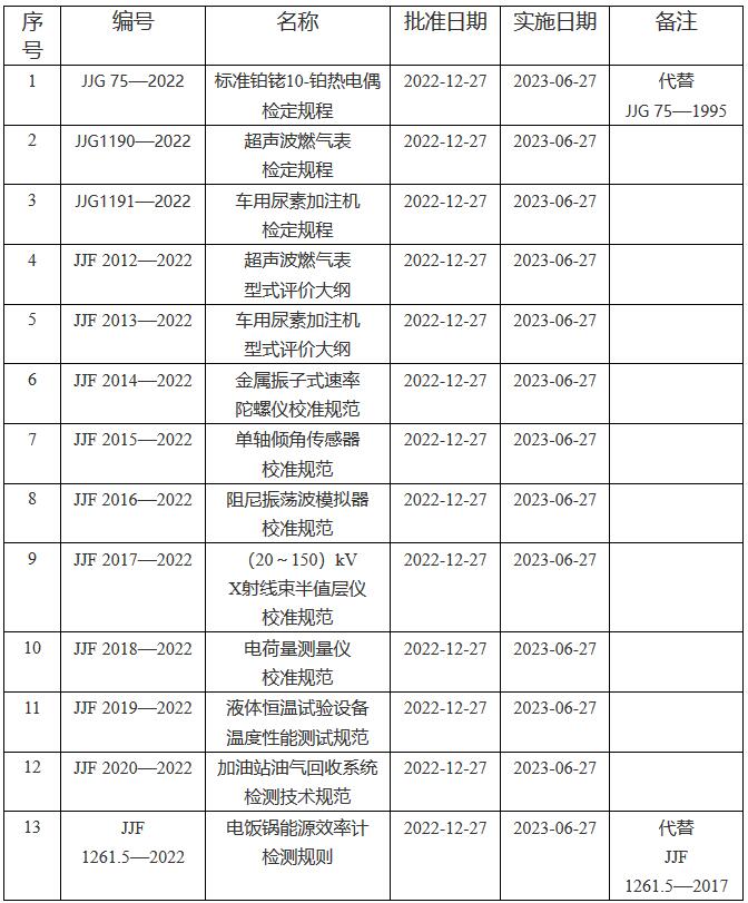 《市場監(jiān)管總局關(guān)于發(fā)布〈標(biāo)準(zhǔn)鉑銠10-鉑熱電偶檢定規(guī)程〉等13項國家計量技術(shù)規(guī)范的公告》(國家市場監(jiān)督管理總局公告2022年第45號)