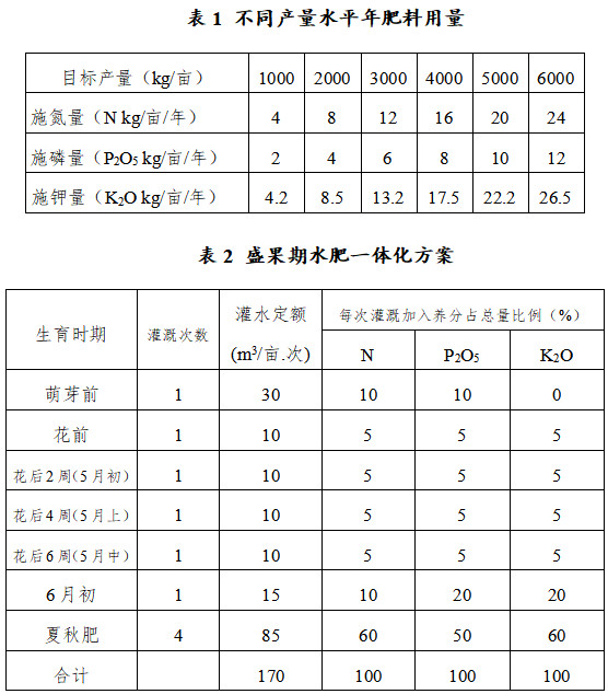 盛果期蘋(píng)果N:P2O5:K2O比例為2:1:2-2.1,各個(gè)產(chǎn)量水平年肥料用量見(jiàn)表1,水肥一體化方案見(jiàn)表2。