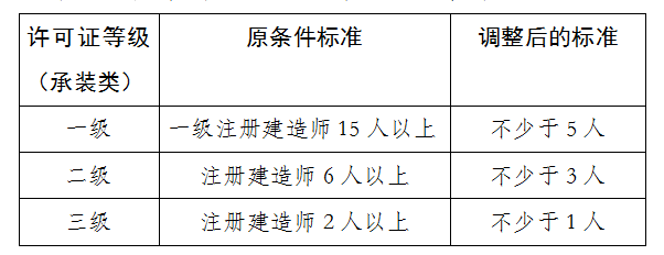 1. 對(duì)承裝類承裝(修、試)電力設(shè)施許可證申請(qǐng)條件中要求的電力相關(guān)專業(yè)注冊(cè)建造師數(shù)量進(jìn)行如下調(diào)整: