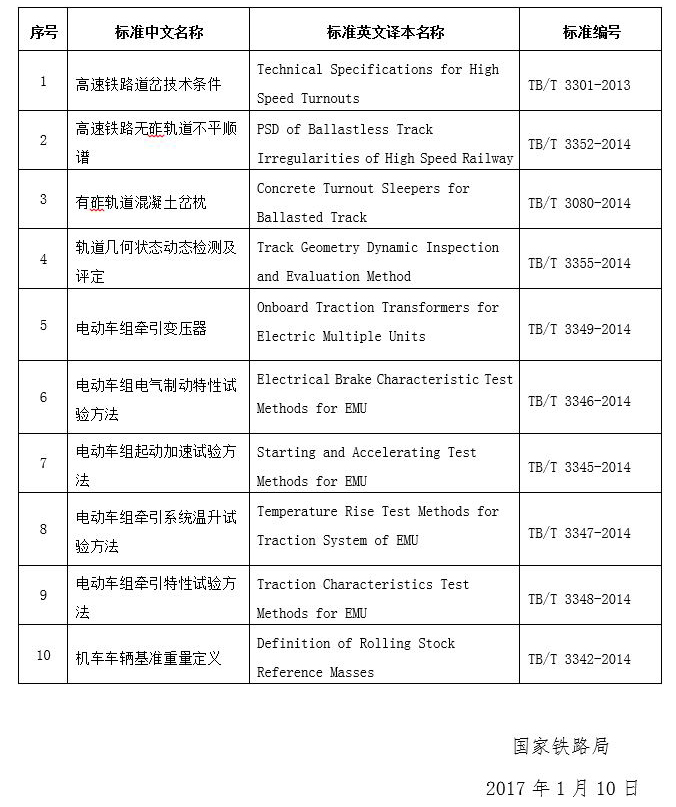 國(guó)家鐵路局關(guān)于發(fā)布《高速鐵路道岔技術(shù)條件》等10項(xiàng)鐵道行業(yè)技術(shù)標(biāo)準(zhǔn)英文譯本的公告