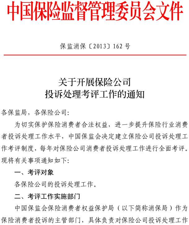 保監(jiān)消保〔2013〕162號(hào)《中國(guó)保監(jiān)會(huì)關(guān)于開展保險(xiǎn)公司投訴處理考評(píng)工作的通知》【全文廢止】