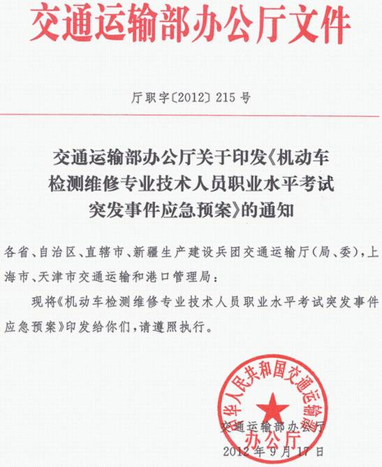 廳職字〔2012〕215號(hào) 交通運(yùn)輸部辦公廳關(guān)于印發(fā)《機(jī)動(dòng)車檢測(cè)維修專業(yè)技術(shù)人員職業(yè)水平考試突發(fā)事件應(yīng)急預(yù)案》的通知