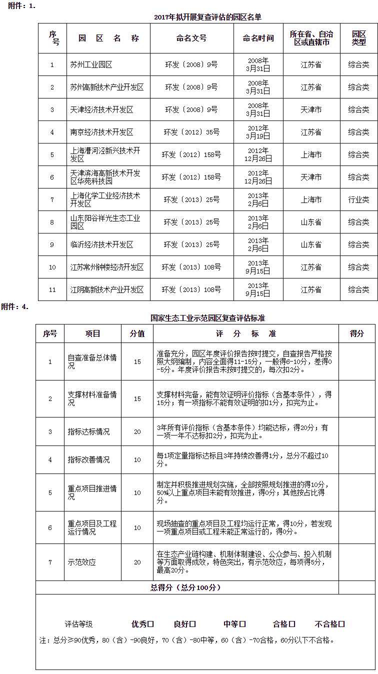為規(guī)范和指導此次復查評估工作,特制定《國家生態(tài)工業(yè)示范園區(qū)復查評估工作方案》(見附件2)、《國家生態(tài)工業(yè)示范園區(qū)自查報告編寫提綱》(見附件3)和《國家生態(tài)工業(yè)示范園區(qū)復查評估標準》(見附件4)一并印發(fā)給你們。請根據工作方案中的有關要求,提前做好相關準備工作,現(xiàn)場評估時間另行通知。