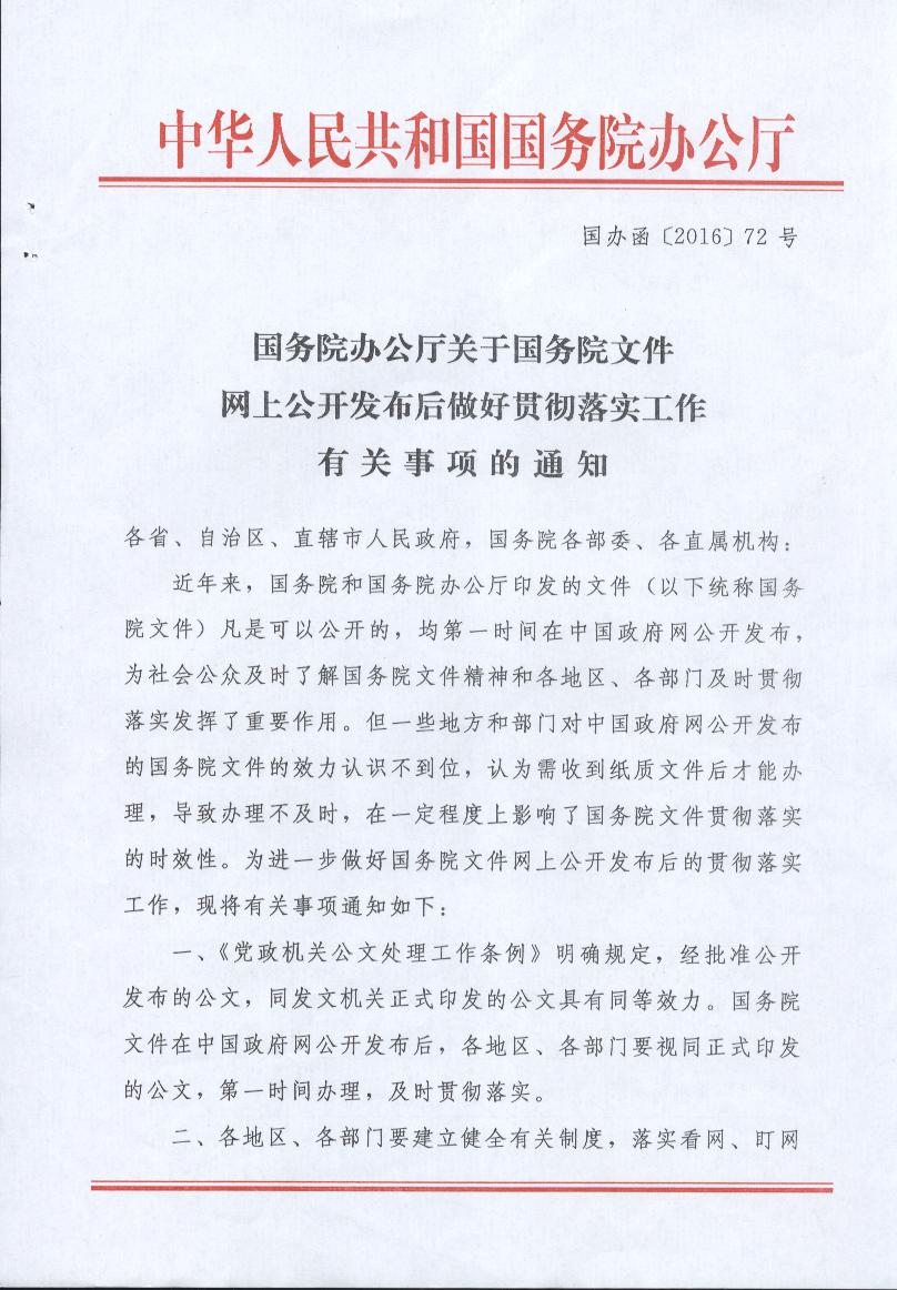 國辦函〔2016〕72號(hào)《國務(wù)院辦公廳關(guān)于國務(wù)院文件網(wǎng)上公開發(fā)布后做好貫徹落實(shí)工作有關(guān)事項(xiàng)的通知》