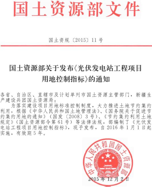 國土資規(guī)〔2015〕11號 國土資源部關(guān)于發(fā)布《光伏發(fā)電站工程項目用地控制指標(biāo)》的通知