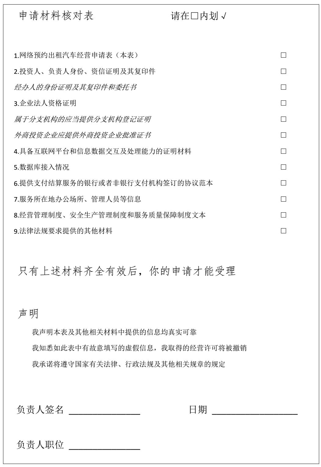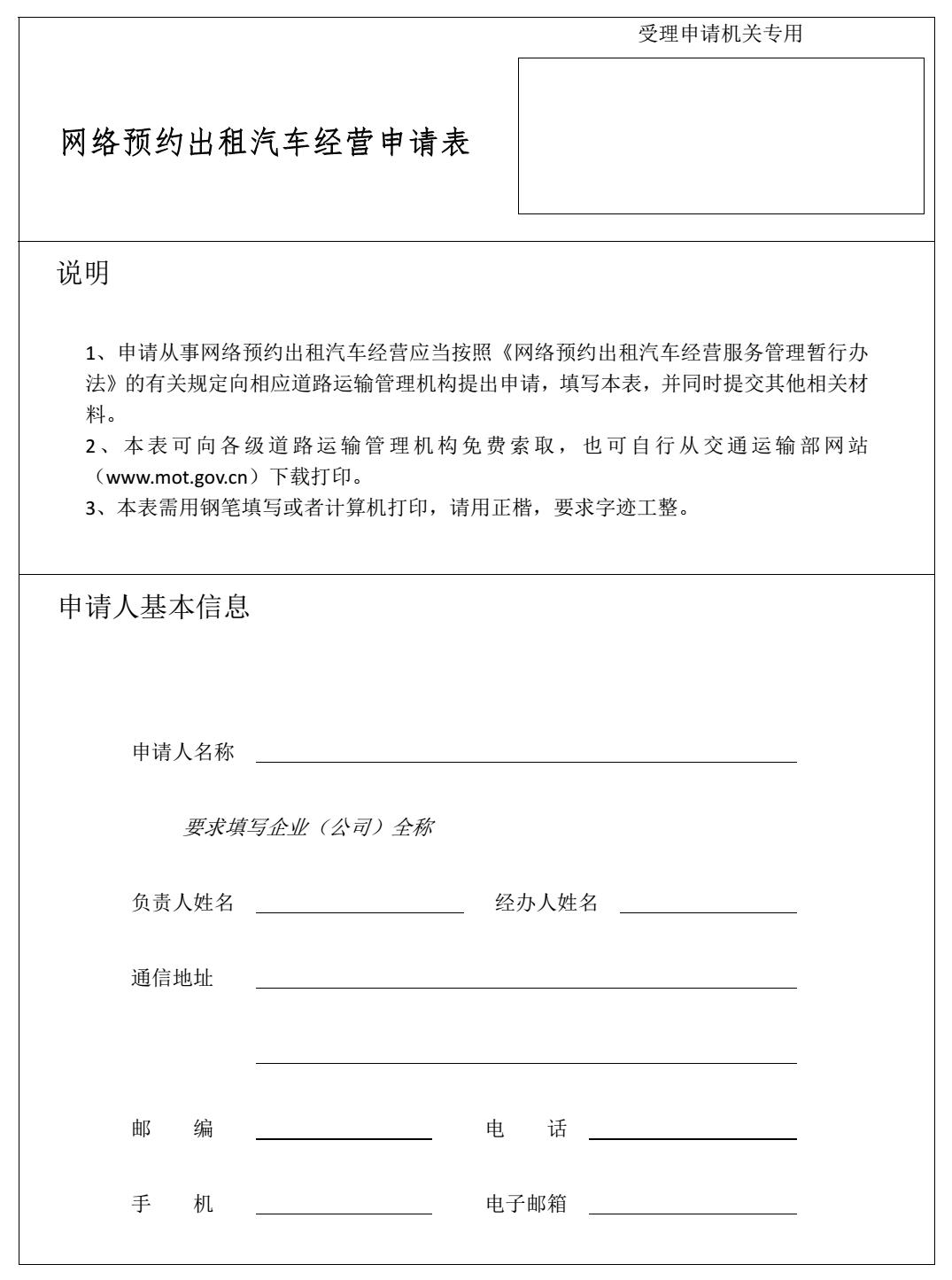 (一)網(wǎng)絡(luò)預(yù)約出租汽車(chē)經(jīng)營(yíng)申請(qǐng)表(見(jiàn)附件);