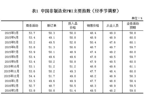 2016年3月中國非制造業(yè)商務(wù)活動(dòng)指數(shù)為53.8%