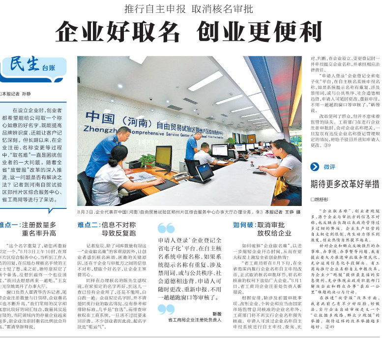 《河南日報(bào)》:企業(yè)好取名創(chuàng)業(yè)更便利 取消審批放權(quán)給企業(yè)