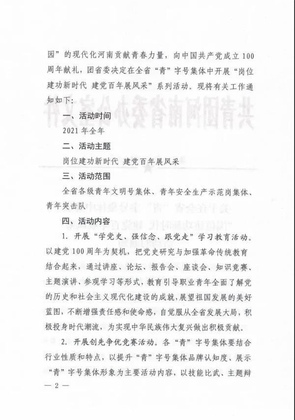 共青團河南省委辦公室關于在全省“青”字號集體中開展“崗位建功新時代建黨百年展風采”活動的通知 豫青辦字〔2021〕6號