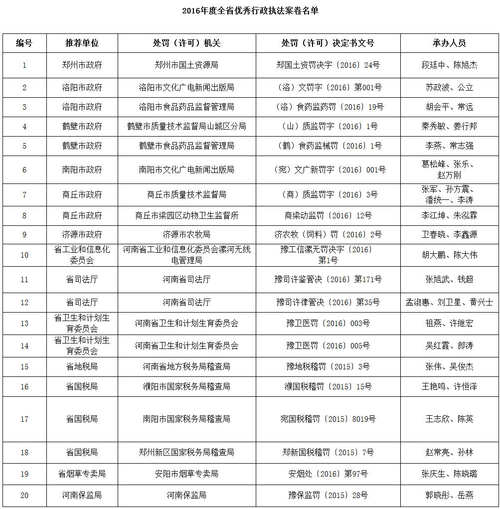 河南省全面推進依法行政工作領(lǐng)導(dǎo)小組辦公室關(guān)于2016年度優(yōu)秀行政執(zhí)法案卷評選情況的通報