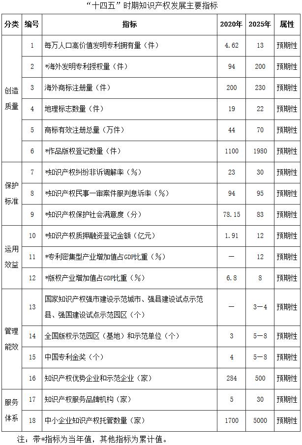 知識產(chǎn)權(quán)運用效益明顯提升。政策完善、要素完備、體系健全、運行順暢的知識產(chǎn)權(quán)運營服務體系更加高效;知識產(chǎn)權(quán)融資渠道更加順暢、產(chǎn)品更加多樣;知識產(chǎn)權(quán)證券化取得突破;知識產(chǎn)權(quán)轉(zhuǎn)移轉(zhuǎn)化機制更加健全;專利密集型產(chǎn)業(yè)增加值和版權(quán)產(chǎn)業(yè)增加值占GDP的比重穩(wěn)步提升。