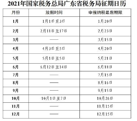 國家稅務總局廣東省稅務局關(guān)于印發(fā)《2021年國家稅務總局廣東省稅務局征期日歷》的通知